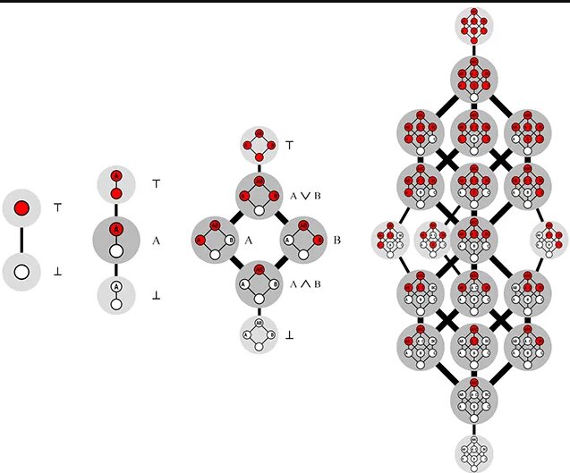 بهگفتهی وان هیرتوم، میتوان تابع بولی یکنوا را مانند یک بازی با مکعب n بعدی در دو و سه و بینهایت بُعد در نظر گرفت. میتوان مکعب را روی یک گوشه موازنه کرد و سپس رنگ هرکدام از گوشههای باقیمانده میتواند سفید یا قرمز باشد.