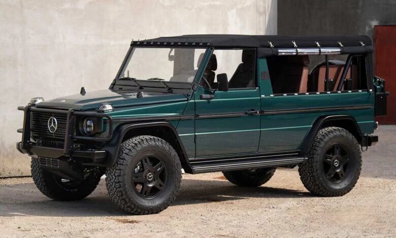 این G کلاس خاص با رنگ سبز نظامی و جزئیات مشکی، وفاداری خود را به ریشه‌هایش حفظ کرده است. سقف پارچه‌ای تاشو، گارد جلو و لاستیک‌های پهن که روی رینگ‌های ۱۸ اینچی مرسدس آستاروث سوار شده‌اند، ظاهری خشن و آماده برای ماجراجویی به آن می‌بخشند. یکی از ویژگی‌های جذاب و کلاسیک این خودرو، قابلیت خواباندن شیشه جلو است که تجربه‌ای بی‌نظیر از رانندگی در طبیعت را فراهم می‌کند.