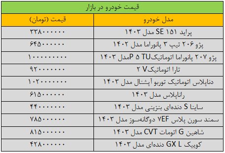 سرگیجه قیمتها در بازار خودرو/ آخرین قیمت پراید، پژو، سمند، دنا، تارا و کوییک + جدول