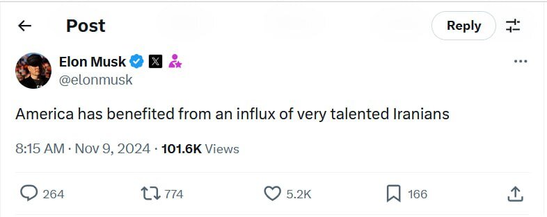 به گزارش خبرگزاری خبرآنلاین، ایلان ماسک در پاسخ به کاربری ایرانی که داستان زندگی و مهاجرت خود را منتشر کرده بود نوشت: آمریکا از ورود ایرانیان بسیار با استعداد بهره برده است.
